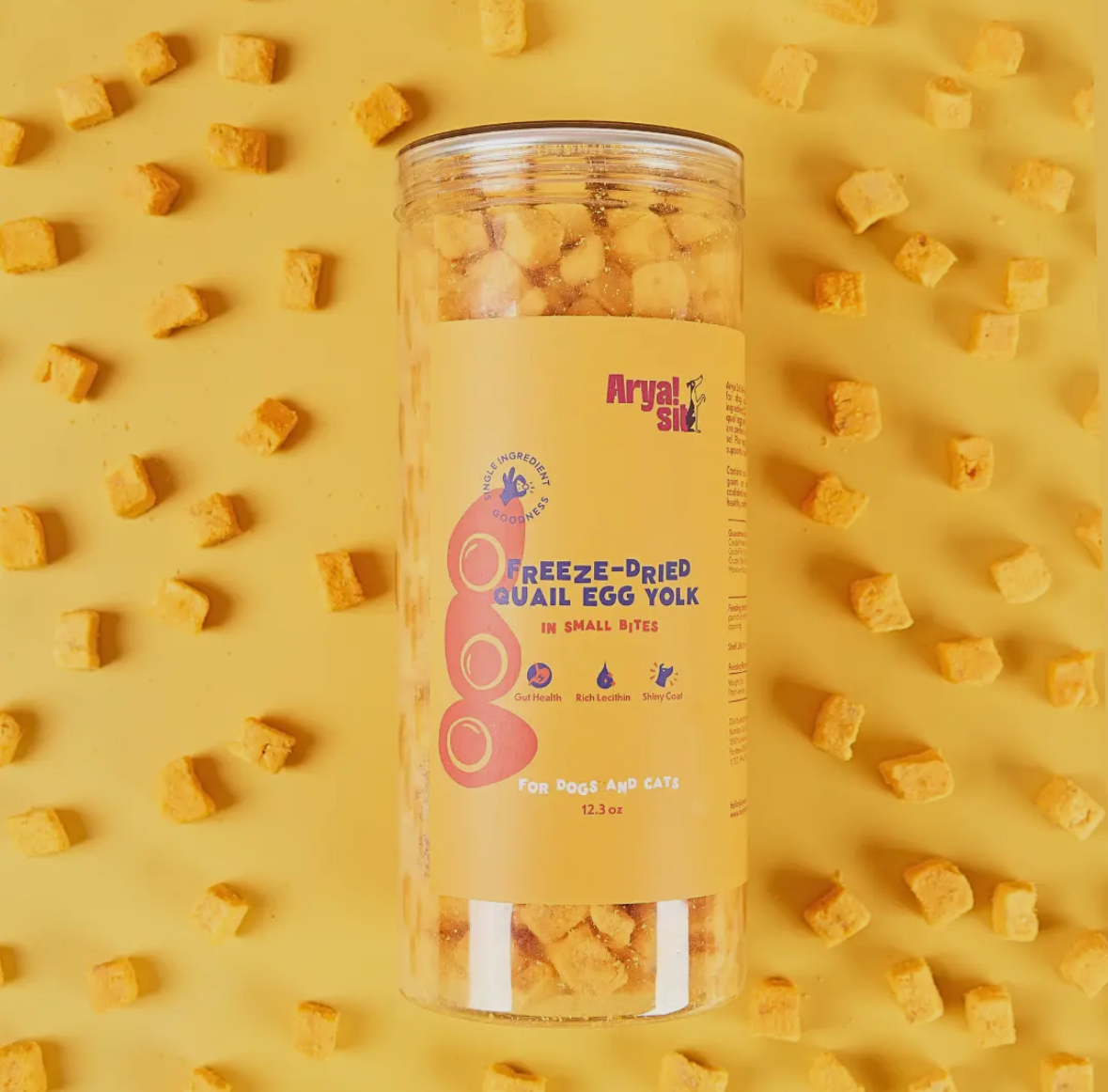 Arya Sit! all-natural freeze-dried treat for dogs and cats is made with a single ingredient: Quail Egg Yolk! Our freeze-dried egg yolk is rich in lecithin, which supports a healthy and shiny coat. Contains no artificial flavors, sweeteners, grains or preservatives, you can feel confident knowing that your pet is getting a healthy, nutritious snack.